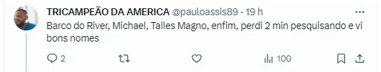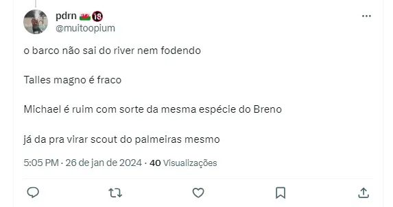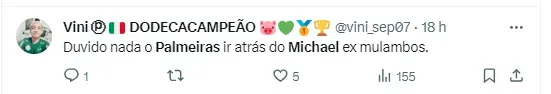 No fim da informação, o profissional expôs o nome em questão: “Michael, atacante que já pertenceu ao Flamengo e hoje atua no Al-Hilal. Jogador de velocidade que atende às necessidades do Palmeiras. O Verdão está no mercado”, completou.