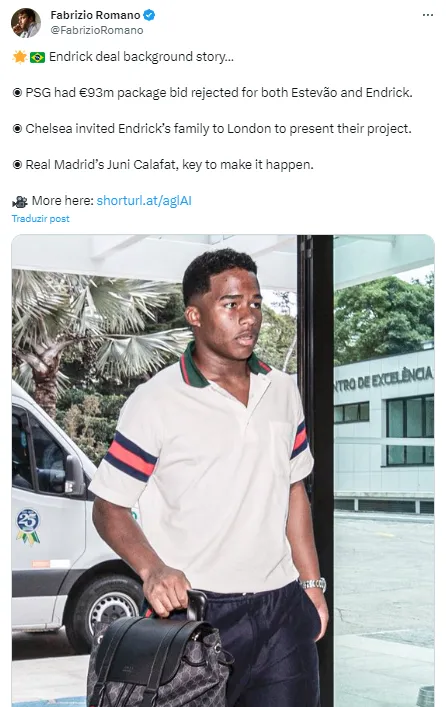 De acordo com o jornalista italiano Fabrizio Romano, o Palmeiras chegou a recusar na época uma oferta de R$ 491 milhões do PSG pela dupla Endrick e Estevão. O negócio foi colocado na mesa da diretoria em novembro de 2022, o que recebeu detalhes agora.