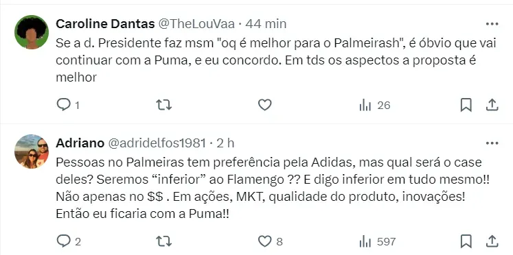 Vale destacar que as outras marcas que estão na disputa com a Puma, para ser a nova fornecedora do Palmeiras, é a Legea e Adidas. Dentre eles, os italianos têm a segunda melhor oferta, mas o que acaba pesando é que eles não têm uma distribuição no Brasil, o que gera preocupação nos bastidores.