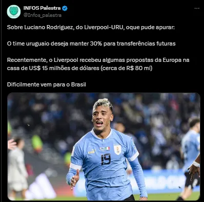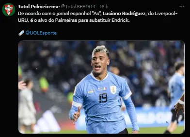 Porém, isso parece ter mudado. O jornal AS, da Espanha, trouxe que o atacante Luciano Rodríguez, que já esteve na mira de alguns times brasileiros, era o alvo do Verdão para repor a perda de Endrick.