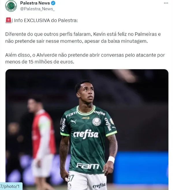Diferente do que outros perfis falaram, Kevin está feliz no Palmeiras e não pretende sair nesse momento, apesar da baixa minutagem, de acordo com informação exclusiva do perfil Palestra News, que cobre o dia a dia do Palmeiras nas redes sociais. O camisa 37 quer ter minutos com Abel Ferreira.