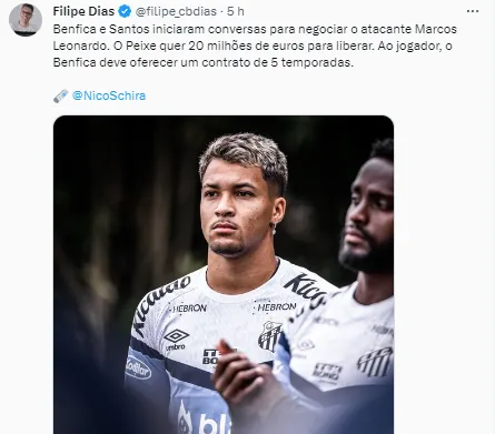 “Artilheiro do Santos nas duas últimas temporadas, Marcos Leonardo interessa ao Palmeiras, mas mantém o desejo de ser vendido para Europa”, informou Filipe Dias, reforçando que o foco do atacante é a Europa.