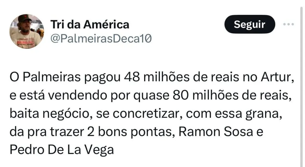 A torcida do Palmeiras entende que Anderson Barros precisaria trazer um meia mais experimente para exercer a função de Raphael Veiga e um camisa 9 para chegar ao lugar de Endrick, que no meio do ano será jogador do Real Madrid em definitivo.