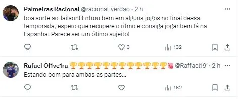 Ao todo, Jaílson atuou em 46 jogos com o Manto palestrino e marcou apenas um gol. Além dos campeonatos brasileiros citados, o meio-campista também conquistou o bicampeão paulista (2022 e 2023), a Recopa (2022) e a Supercopa do Brasil (2023).