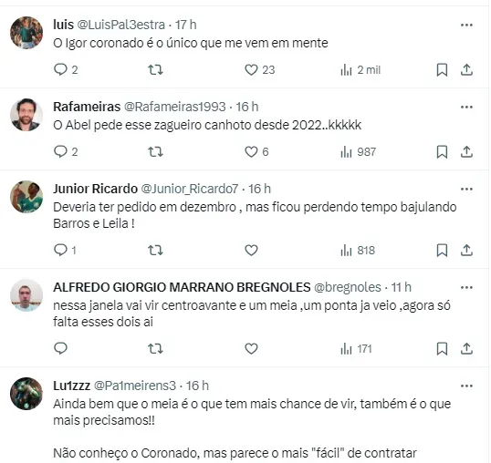 Os torcedores do Maior Campeão Nacional esperam que a direção do Palmeiras consiga sacramentar novos reforços para qualificar o elenco de Abel Ferreira, visto que a equipe vem de anos muito vitoriosos.