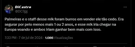 Vale lembrar, que o atacante é o principal jogador do time após a saída de Endrick que esta foi para o Real Madrid. Outro comentário foram alguns torcedores do Palmeiras pedindo para cancelar a venda para o Chelsea.