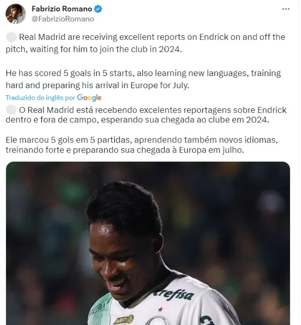 “O Real Madrid está recebendo excelentes reportagens sobre Endrick dentro e fora de campo, esperando sua chegada ao clube em 2024. Ele marcou 5 gols em 5 partidas, aprendendo também novos idiomas, treinando forte e preparando sua chegada à Europa em julho”, escreveu o jornalista no X (antigo Twitter).
