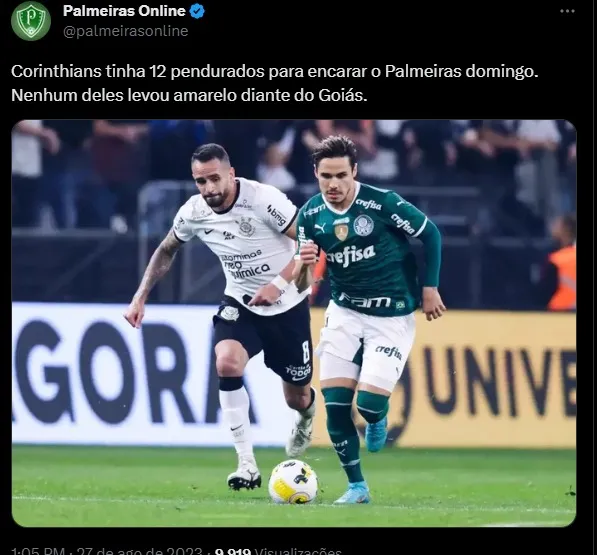 Isso porque, no empate do Corinthians contra o Goiás, por 1 a 1, no último sábado (26), nenhum jogador pendurado do rival palmeirense recebeu cartão amarelo. E olha que a lista era grande: Cássio, Fagner, Caetano, Gil, Matheus Bidu, Fausto Vera, Gabriel Moscardo, Maycon, Roni, Ruan Oliveira, Biro e Yuri Alberto.
