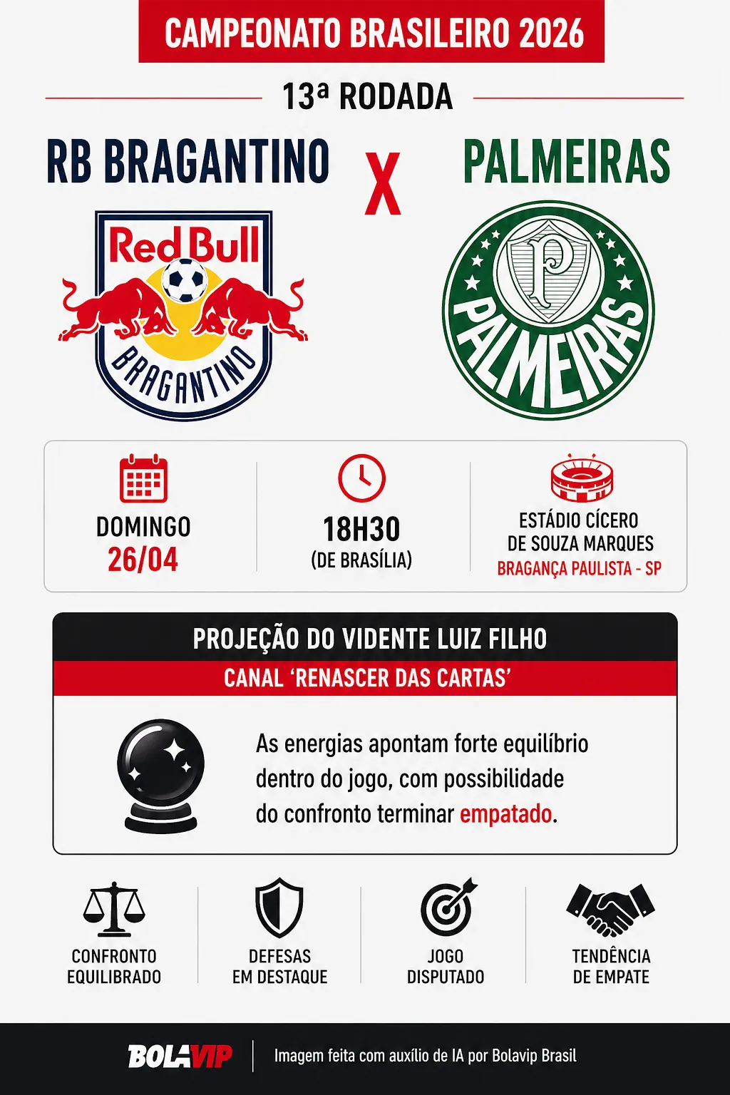 De acordo com ele, as cartas para o RB Bragantino, no geral, estão um pouco melhores. A leitura aponta para um time com mental mais firme, além de aspectos ligados à força e à resistência, o que pode fazer diferença ao longo da partida.