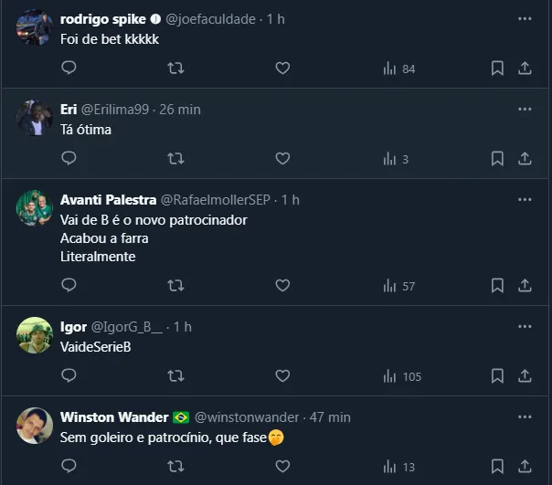 Até por isso, a rescisão com casa de apostas foi o estopim para uma série de provocações e comentários de palmeirenses nas redes sociais, como você pode visualizar abaixo.
