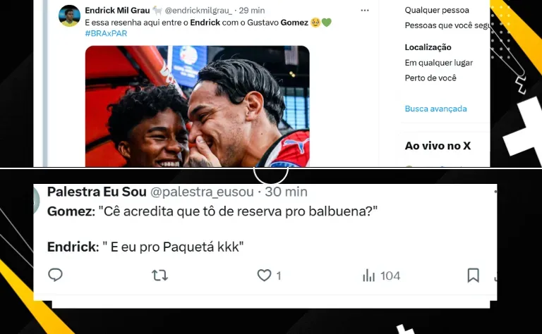O garoto de 17 anos, então, compartilharia da visão do companheiro de Palmeiras, já que não consegue ser titular de Dorival, nem mesmo com três gols em cinco partidas pela Seleção. “E eu sou (reserva) para o Paquetá”, diz o palmeirense sobre eventual resposta de Endrick.