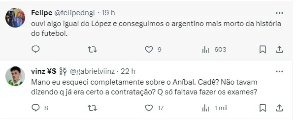 Com tudo já praticamente acertado entre Palmeiras e o atleta, agora a negociação deve seguir junto ao Racing. Porém, o Verdão vê a situação de forma positiva, já que é desejo de Aníbal jogar no Alviverde.