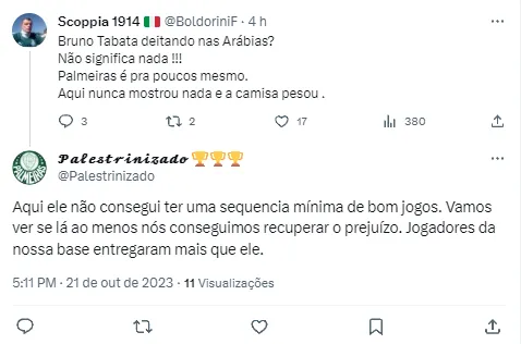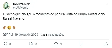 A principal reclamação da torcida do Palmeiras na temporada é quanto a falta de reforços na temporada. Mesmo com os pedidos de Abel Ferreira por novas peças no time, a presidente Leila Pereira e o coordenador Anderson Barros seguiram adotando uma postura cautelosa, de observação e busca por oportunidades mais baratos. No fim, apenas Richard Ríos e Artur chegara, enquanto que algumas saídas seguem dando o que falar. Isso aconteceu agora com Bruno Tabata.