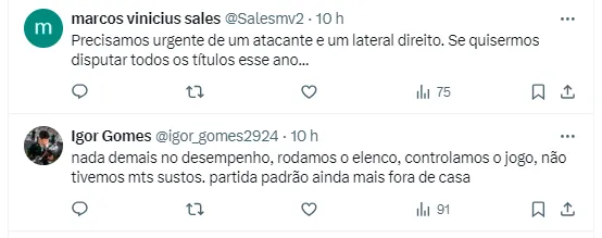 Em contrapartida, muitos torcedores parecem ter perdido a paciência com um jogador específico. Gabriel Menino foi criticado pelos adeptos do Maior Campeão Nacional, por seu desempenho.