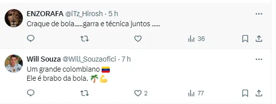 “Feliz pelo resultado, começar com o pé direito é sempre bom no Brasileiro. Então, parabenizar o time aí. Acho que tem muito sentido no que o nosso treinador fala que só temos 24 horas para comemorar ou para aceitar a derrota”, iniciou o colombiano.