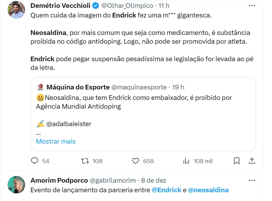 Só que reportagem do portal ‘Máquina do Esporte’ faz um alerta: a Neosaldina, para quem não sabe, é uma droga proibida pela Agência Mundial Antidoping (Wada).