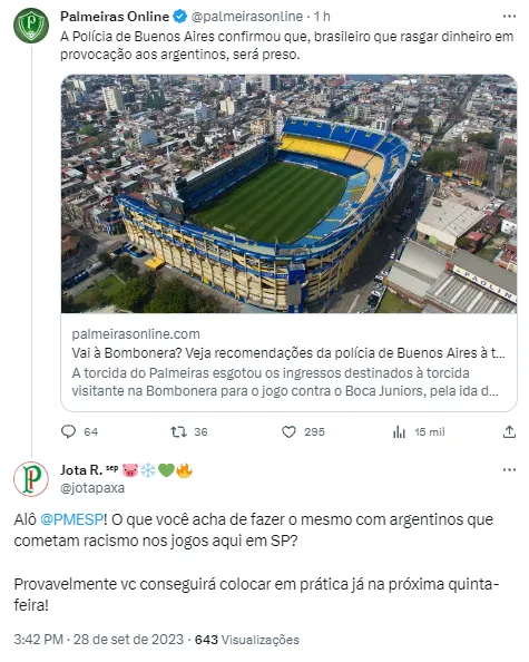 Em publicação do portal Palmeirasonline.com, os torcedores que vão à Bombonera se atualizaram de uma recomendação principal que pode custar a liberdade deles caso desrespeitada. Com um histórico recente de brasileiros que rasgam dinheiro na Argentina, de forma provocativa, os alviverdes que fazerem isso agora podem para na cadeia. A notícia foi dada também pelo Uol, que afirmou a intenção da polícia local em ser “rigorosa”.