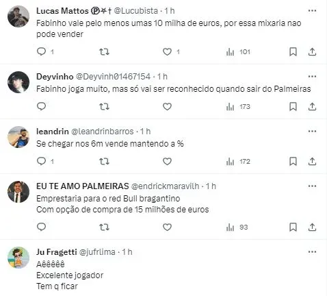 Fabinho é uma das joias da base palestrina, com características de liderança que logo o alçou a ser o capitão das categorias que formam atletas na Academia de Futebol. Ainda segundo apuração da ESPN, a direção Alviverde descarta qualquer negociação no momento, já que conta com Fabinho para 2024. O Palmeiras enfrenta o América-MG, nesta quarta-feira (29).