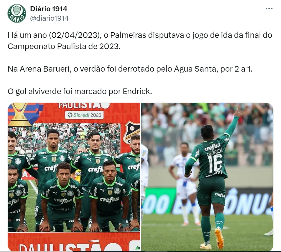 Já na primeira partida da final do Campeonato Paulista, o jogador de 17 anos não conseguiu se destacar e o Verdão perdeu de 1 a 0 para o Santos, na Vila Belmiro, no último domingo (31).