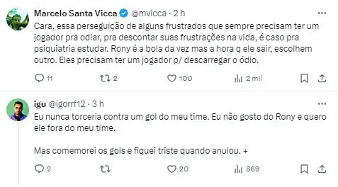Após a partida, Rony concedeu entrevista na zona mista e abordou a onda de críticas que a parte da torcida faz sobre suas atuações. “Querendo ou não, você vê muitas coisas negativas e fica meio chateado. Quando se faz um gol, é possível mostrar que só com trabalho e fé é possível dar a resposta”, iniciou o jogador.