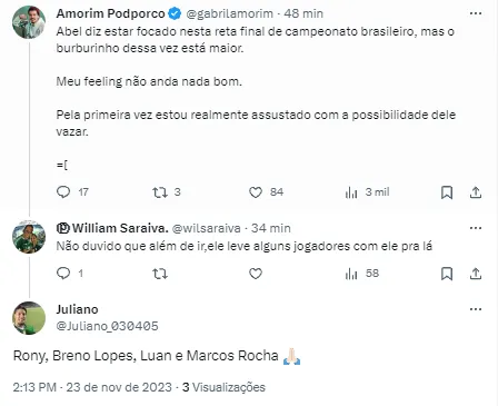 Uma parte dos alviverdes começou a sugerir atletas que não vêm jogando bem no Palestra para Abel Ferreira levar. Nessa linha, os torcedores citaram Rony, Luan, Marcos Rochas e mais alguns nomes em baixa na equipe paulista.