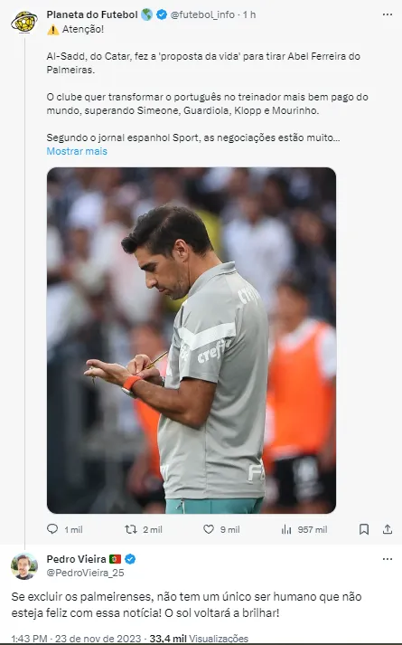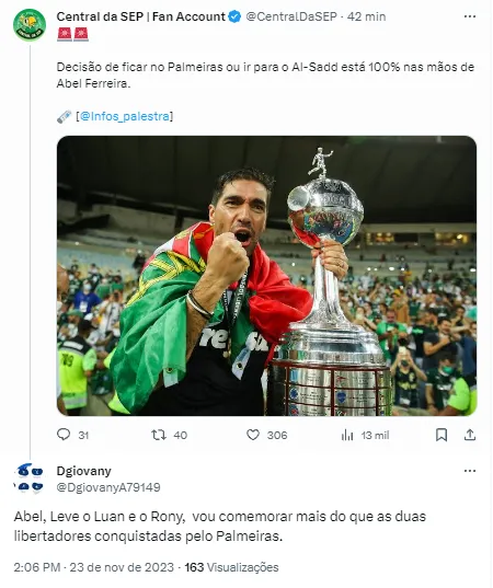 Mesmo que não tenha nada certo ainda sobre a saída de Abel Ferreira, torcedores de outras equipes rivais ao Palmeiras compartilharam a informação do interesse do Qatar com vibração. Bicampeão da Libertadores, o português pode mesmo se despedir desta vez.