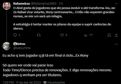 Para Rony, a possível saída de Abel era uma surpresa, já que o técnico não compartilhou esses planos com os jogadores. O atacante destacou a identificação de Abel Ferreira com o clube e a torcida como fatores determinantes em sua permanência.
