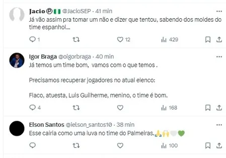 Em decorrência disso, a diretoria palmeirense agora corre atrás de um substituto, visando alguém que tenha facilidade em atuar pelos lados do ataque, com bastante velocidade, podendo repor justamente essa baixa no elenco.