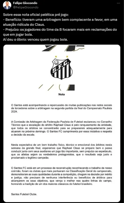 Nas redes sociais, os santistas se revoltaram com o lance. Para se ter ideia, durante a partida, um assunto que tomou conta da web foi a lembrança de um clássico entre Palmeiras e São Paulo em que Rafinha ao ser expulso saiu de campo reclamando e dizendo que o juiz era palmeirense.