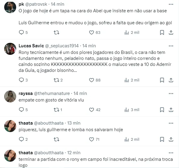 Nas redes sociais, muitos palmeirenses reclamam do esquema tático de Abel Ferreira jogando com dois laterais pelas pontas. Os alviverdes ainda pedem a entrada do meio-campo Rômulo, recém-contratado pelo Verdão.
