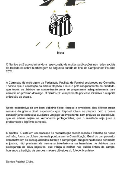 “○ Santos está acompanhando a repercussão de muitas publicações nas redes sociais de torcedores sobre a arbitragem na segunda partida da final do Campeonato Paulista 2024. Nesta expectativa de um bom trabalho fisico, técnico e emocional dos arbitros nesta semana da grande final, esperamos que Raphael Claus se prepare bem e possa conduzir junto com seus auxiliares um jogo tão importante, sem prejuízo ao espetáculo”, diz parte da nota.
