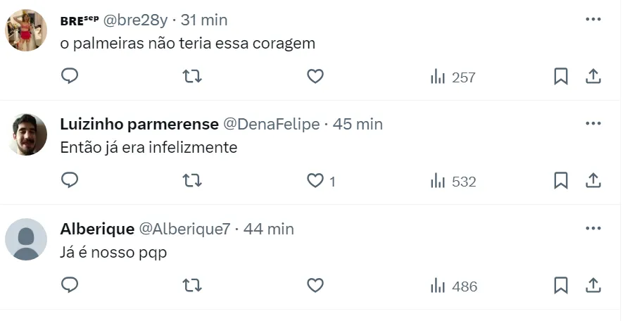 Os torcedores não gostariam que o Alviverde contratasse Caio Paulista, ainda mais pelos valores envolvidos. No contrato com o São Paulo, o passe fixado era de 3,5 milhões de euros (cerca de R$ 18 milhões na cotação atual).