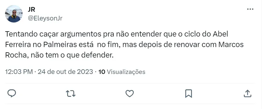 “É uma decisão pessoal dele. Se eu fosse o Abel, eu iria embora. Você não tem direito de ter um ano abaixo. Não existe crédito algum. Você ganha tudo e em um ano abaixo começa um monte de cornetagem, bagunça e confusão. Era um ano para o Palmeiras ficar tranquilo, mesmo se não tiver grandes resultados. No futebol brasileiro, não tem crédito e gratidão”, afirmou o jornalista nesta terça-feira (24).