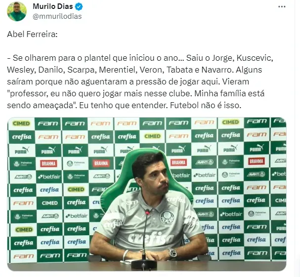 “Alguns deles (jogadores) saíram porque não aguentaram a pressão de jogar aqui. (…) ‘Eu estou a ter minha família ameaçada’. Quando isso acontece e o jogador vem falar isso comigo, eu tenho que entender, porque o futebol não é isso. (…) Pediram para sair e saíram”, disse Abel. Vale lembrar que o Verdão perdeu jogadores como os meio-campistas Danilo e Gustavo Scarpa, e os atacantes Verón, Tabata, Giovane, Merentiel e Rafael Navarro.
