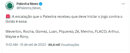 A bola rola para Palmeiras e Goiás a partir das 21h30 (horário de Brasília), no Allianz Parque. Raphael Veiga, que voltou da Seleção gripado, pode ser opção no banco de reservas. Gustavo Gómez e Piquerez devem ser titulares. Uma provável escalação tem: Weverton, Marcos Rocha, Gustavo Gómez, Luan e Piquerez; Zé Rafael e Gabriel Menino, Arthur, Mayke e Rony; Flaco López.
