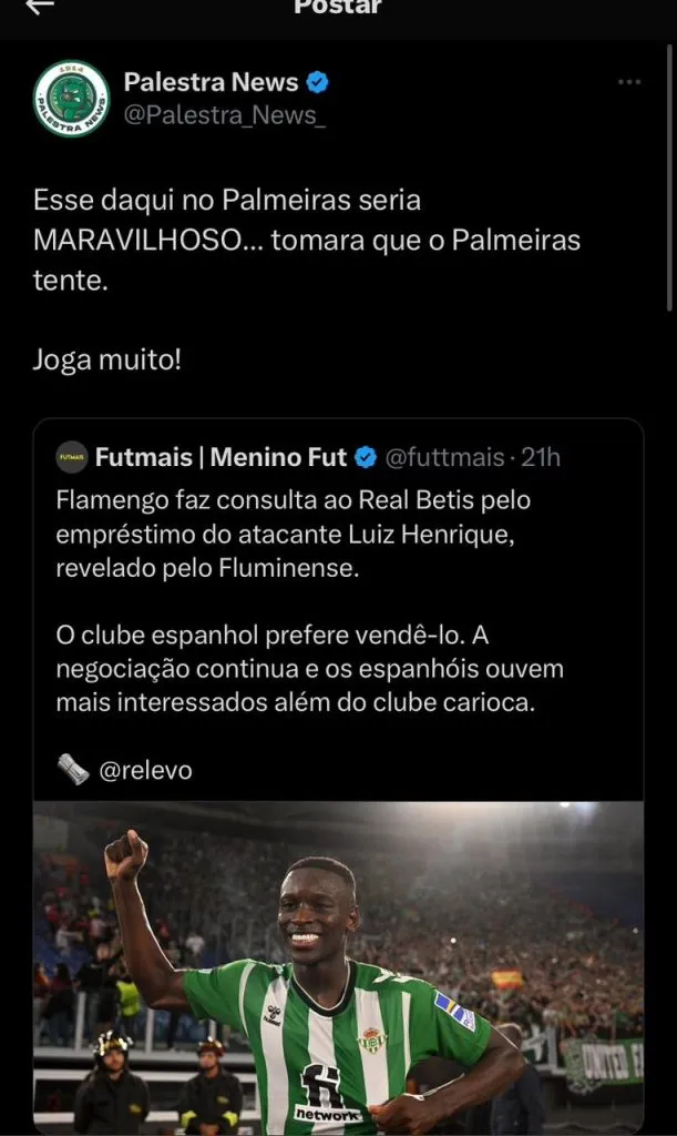 Nas redes sociais, a torcida do Verdão cravou a possibilidade do jogador atuar no time: (SIC) “Esse daqui no Palmeiras seria MARAVILHOSO… tomara que o Palmeiras tente. Joga muito!”; “Joga muito, mas não vem”, foram alguns comentários da torcida do Palmeiras sobre Luiz Henrique.