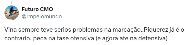 “Viña sempre teve sérios problemas na marcação. Piquerez já é o contrário, peca na fase ofensiva (e agora até na defensiva)”, pontuou.