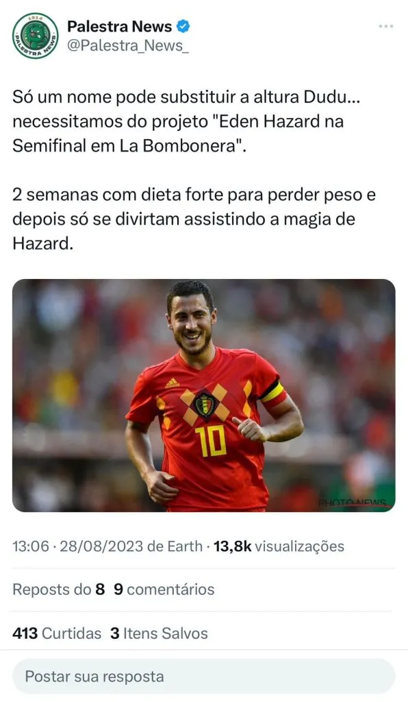 “Seja bem vindo ao Palmeiras, Eden Hazard”, disse um torcedor. “Só um nome pode substituir a altura Dudu… necessitamos do projeto “Eden Hazard na Semifinal em La Bombonera. 2 semanas com dieta forte para perder peso e depois só se divirtam assistindo a magia de Hazard”, avaliou um internauta. “Não ironicamente se jogar 10% do que sabe é um dos melhores do brasil, eu traria facil com contrato até o fim do ano”, avaliou um palestrino.