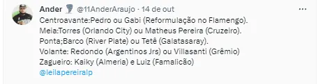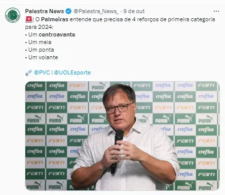 Vale destacar que durante todo este ano o próprio treinador Abel Ferreira fez questão de fazer críticas pela falta de reforços. Na atual temporada, o Verdão contratou apenas dois reforços o atacante Artur e o meio-campista Richard Ríos. Eles chegaram para, na teoria, repor as saídas do meia Gustavo Scarpa e do volante Danilo. Porém, para a próxima temporada, a expectativa é que o Clube gerido por Leila Pereira vá com tudo ao mercado em busca de reforços que para elevar o nível do plantel palmeirense.