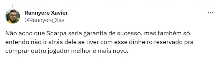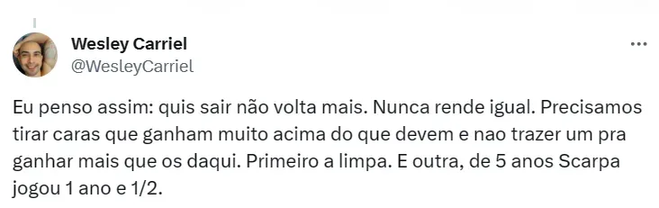 Uma parcela da torcida alviverde acredita que Scarpa deve ser trazido de volta, mas outra não vê o ex-camisa 14 como grande solução para os problemas do time, assim não configurando como uma contratação “de peso”.