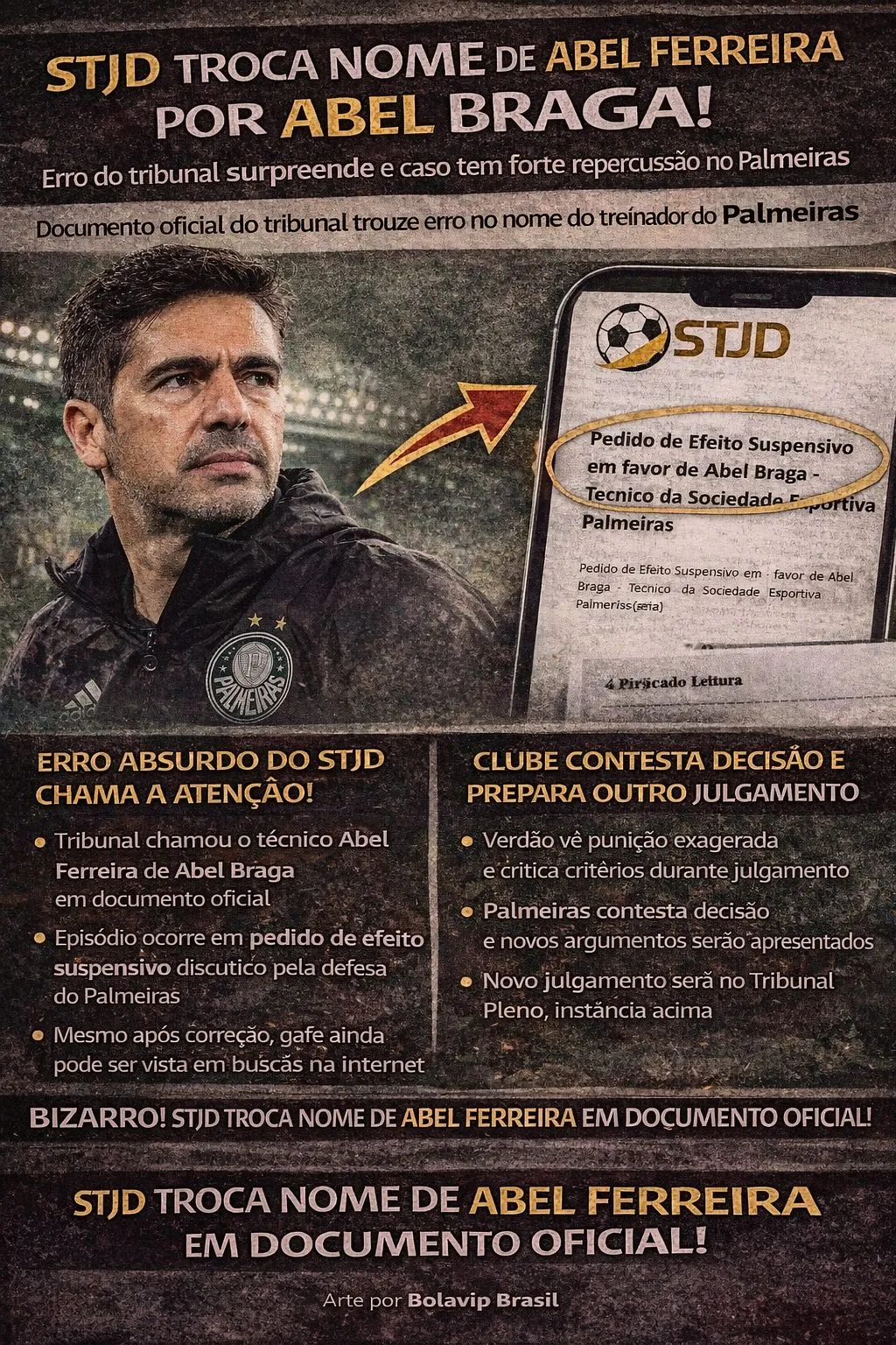 O STJD virou assunto nos bastidores do futebol brasileiro após cometer um erro em documento oficial envolvendo Abel Ferreira. O tribunal se referiu ao técnico do Palmeiras como “Abel Braga”, nome de outro treinador histórico do país, segundo o Lance.