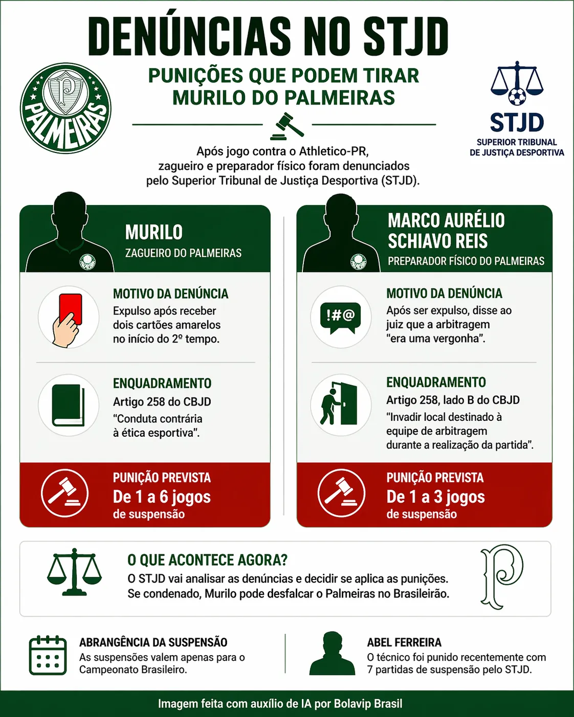 O jogador do Palmeiras pode ter uma penalização de um a seis jogos de suspensão. Além do atleta, o Alviverde também fica de olho em Marco Aurelio Schiavo Reis, preparador físico, denunciado também na partida do Brasileirão.