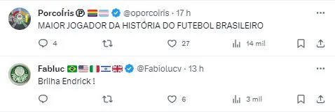 “Esse moleque ganhou três títulos jogando muita bola. É um dos grandes centroavantes dos últimos anos. Para mim, o Endrick vai ser 1 milhão de vezes melhor do que o Vinícius Júnior”, cravou o apresentador durante o programa Os Donos da Bola.