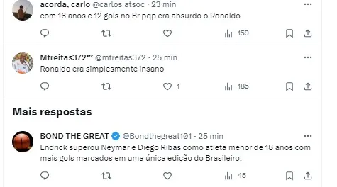 Com os números, Endrick se tornou o primeiro jovem a marcar mais de 10 gols no torneio desde Ronaldo Fenômeno, que marcou 12 em 1993 quando jogava pelo Cruzeiro aos 16 anos, desde então ele lidera esse quesito.