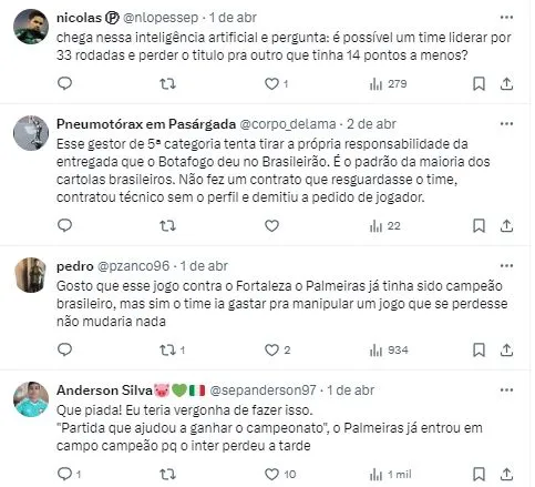 O empresário acredita que suas declarações não são específicas aos Clubes, e justifica: “O único vilão é quem está pagando essas pessoas para fazerem isso. Agora, não é um clube específico. Eu posso dizer que, matematicamente, sim, favoreceu significativamente o Palmeiras. Baseado no que eu vi, mas eu tenho uma visão limitada, eu não tenho poder de investigação”.