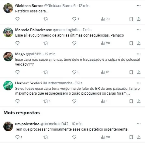 Isso porque, nesta segunda-feira (1), o norte-americano voltou a acusar o Palmeiras de ter sido ajudado. O dirigente foi enfático e aumentou o sarrafo em seu ataque ao Alviverde, pois desta vez, disse que o Palestra está sendo ajudado há dois anos.