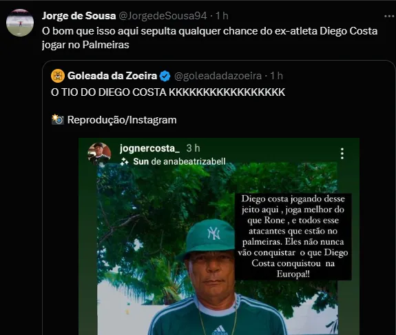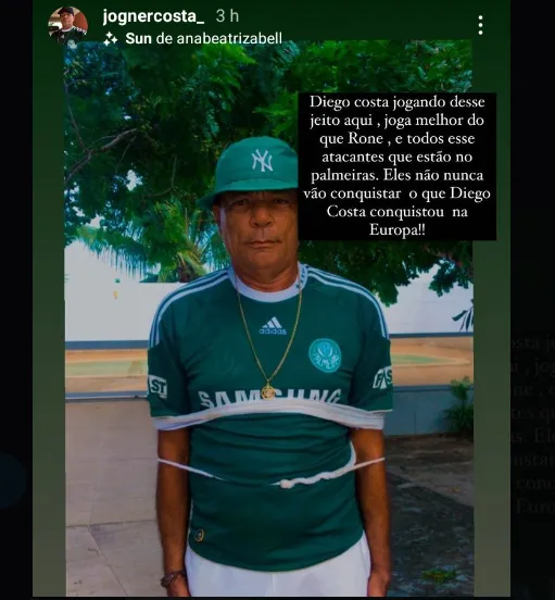 “Diego Costa jogando desse jeito aqui joga melhor que o Rone (Rony) (sic), e todos esses atacantes que estão no Palmeiras. Eles nunca vão conquistar o que Diego Costa conquistou na Europa“, postou Jogner.