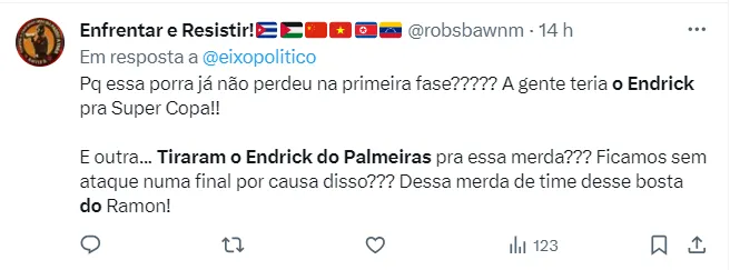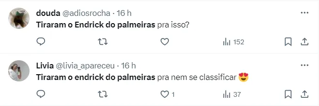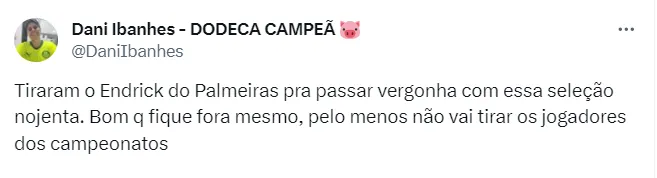 Alguns até comemoraram a eliminação da Amarelinha por conta de Endrick. “Tiraram o Endrick do Palmeiras pra passar vergonha com essa seleção nojenta. Bom que fique fora mesmo, pelo menos não vai tirar os jogadores dos campeonatos”, disse um dos palmeirenses.
