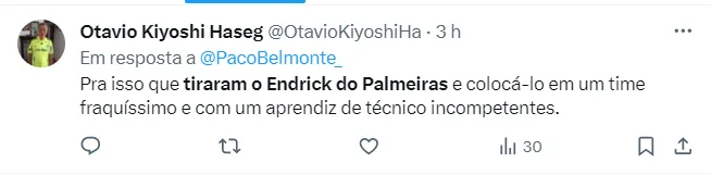Outro alviverde exclamou: “Pra isso que tiraram o Endrick do Palmeiras e colocá-lo em um time fraquíssimo e com um aprendiz de técnico incompetente”. Confira mais comentários da torcida do Verdão ao final da matéria.