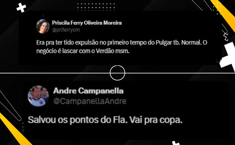 Houve ainda uma possível agressão de Pulgar em Richard Ríos, mas o chileno não foi expulso. Inclusive, para Renata Ruel, o VAR errou. Segundo a comentarista de arbitragem, o flamenguista tinha que ter sido expulso.